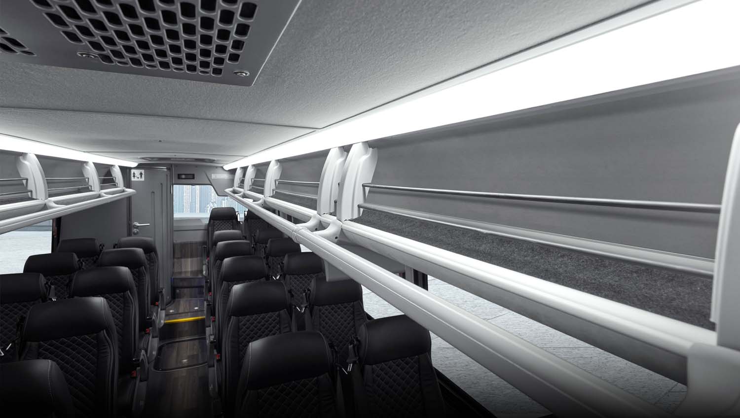 Her ayrıntısı özenle düşünülmüş koltuklar, çift USB-A ve USB-C şarj çıkışları, bardak tutucular, dergi cepleri, ayak dayama yerleri ve farklı kumaş/deri döşeme alternatifleriyle kişisel konforu en üst seviyeye taşır. MCC HVAC sistemi, tüm yolculuk boyunca ideal iklim kontrolünü korur.